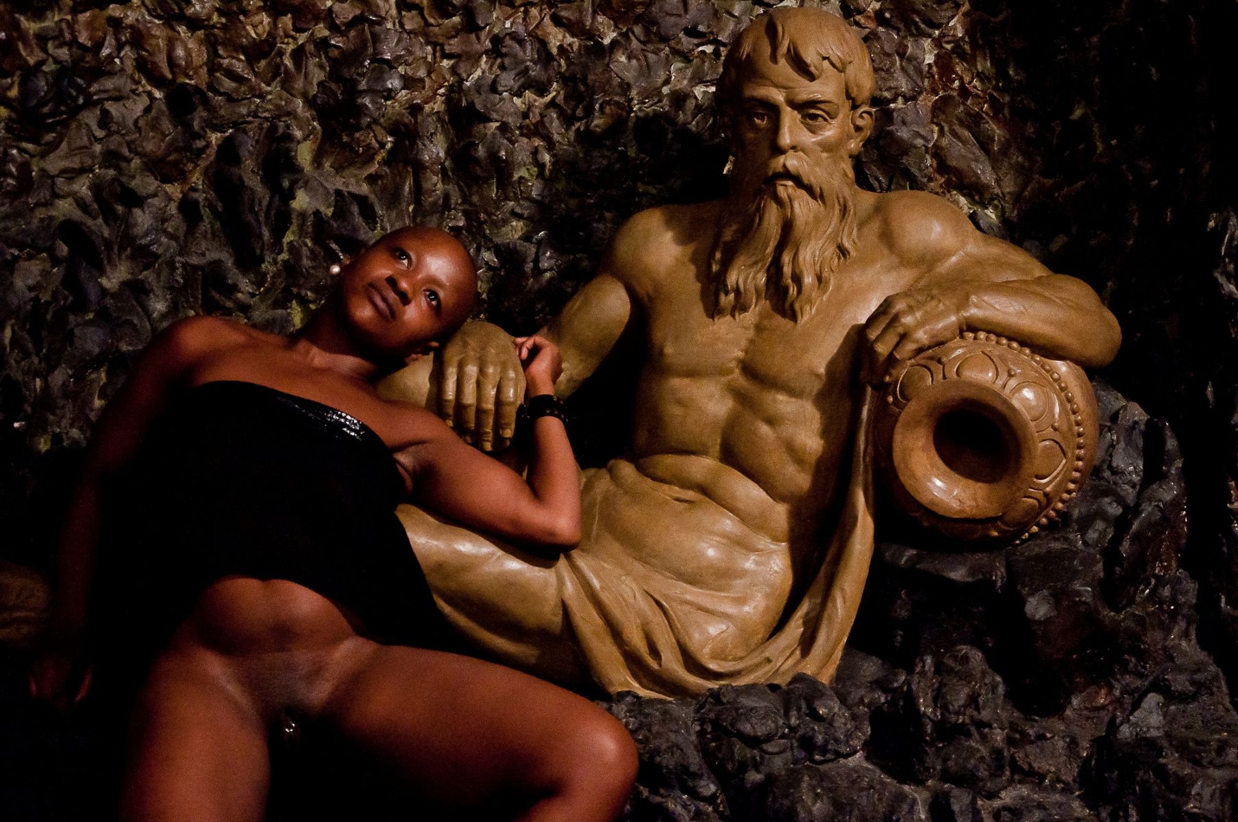 Abaixo Michele em um de suas férteis parcerias, agora com o fotógrafo Fernando Lopes. Nesta fotografia de 2012 a musa deita-se no colo de uma escultura do escultor italiano Pasquale De Chirico (1873-1943) que foi para a Bahia indicado por Teodoro Sampaio (1855-1937). A escolha não poderia ser mais interessante, pois o Palácio Rio Branco, que abriga essa peça, demarca a passagem do modelo politico imperial ao republicano. Tal transição fez com que o edifício ganhasse feições neoclássicas, então o estilo escolhido para figurar os “novos tempos” da Bahia que, supostamente se modernizava. Plenamente incluída no palácio Musa Mattiuzzi fez um corpo a corpo com a estética ocidental.