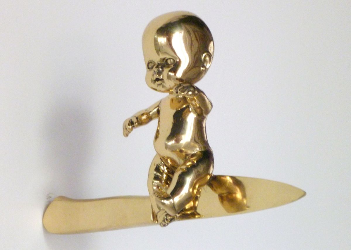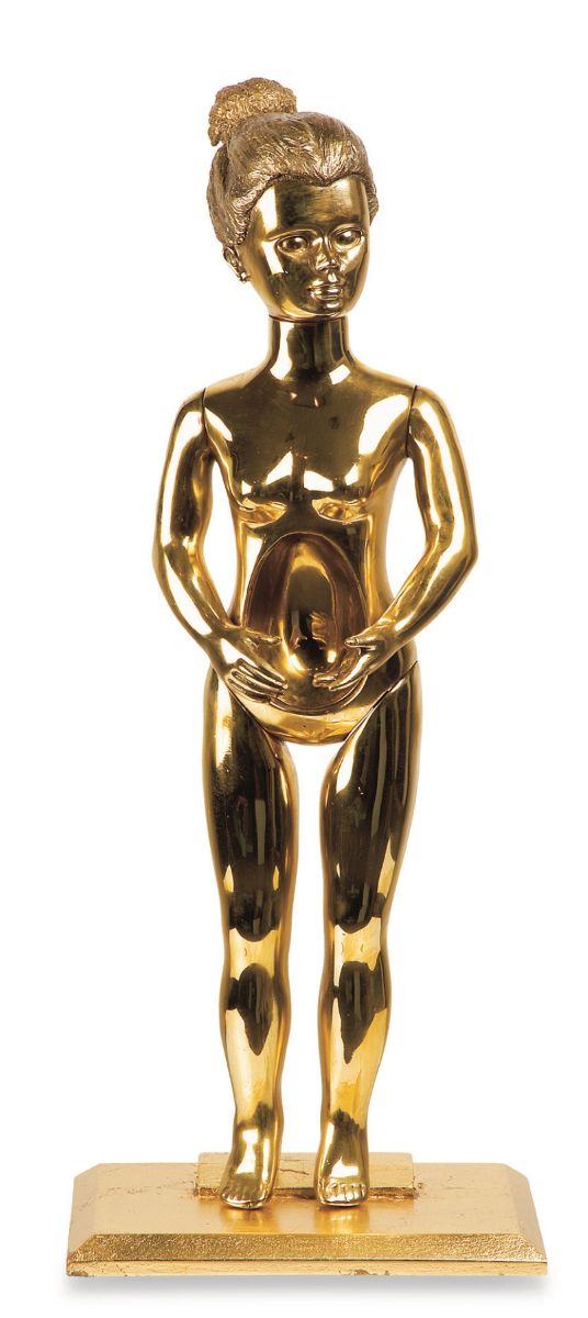 “O grupo de esculturas que estão no afro (o artista se refere ao Museu Afro Brasil) faz parte de um período em que buscava uma obra mais limpa e sintética. Quanto ao uso do dourado, foi o modo que achei para falar de um espelhamento do sujeito e do sagrado – que nunca soube bem se era espiritual, sensual ou sexual, e que de certa forma sempre me remetia a uma falta (a boneca com o ventre vazio, os chinelos sem a pessoa, os objetos da montagem sem os montadores, os balões com suas correntes de motosserra que impedem o toque). Havia e há nesses trabalhos uma frustração e uma impossibilidade que me remete a história do rei Midas em que tudo o que ele tocava transformava-se em ouro, mas contraditoriamente também em tormento…”