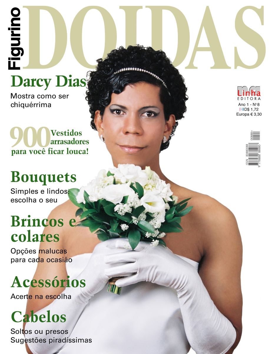 Agora Darcy Dias aparece na capa da revista Doida Figurinos. A intenção é promover os enlouquecedores 900 vestidos de noiva, bouquets, brincos, colares e cabelos apostando no vestido branco, colo descoberto e luvas que dão a ela o tom chiquérrimo das mulheres de Vogui Brasil. Relativamente oculto neste retrato está o clareamento de pele conseguido com a maquiagem branqueadora. Juntamente com o tratamento digital tem-se a aparência aveludada e macia para garantir na mente visual da consumidora o desejo de ser agradável e equilibrada, especialmente no dia feliz dia do casamento. Instituição falida para alguns, mas cujo mercado só cresce, o casamento é uma demanda agora também dos casais gays que incrementam o mercado com suas demandas para a realização da cerimônia ideal.