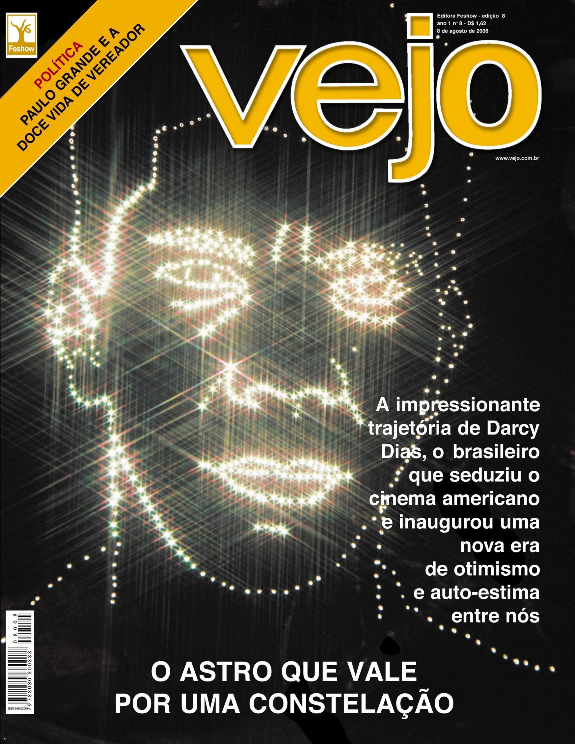 Em Culta novamente o artista investe no retrato PB revigorando o estereótipo em torno da figura do artista genial, mas amplamente desconhecido, cuja a obra passou despercebida, mas que um crítico de arte, Vitor Brito, reanima em “Nuca fui Picasso. O retrato remete ao passado e a estética dos filmes noir das décadas 1940-50, como se Darcy Dias já estivesse morto e sua obra agora começasse a ser valorizada. Ao contrário das outras capas essa tem uma densidade temporal, na medida em que parece uma imagem de arquivo. A morte é o tema tratado em Morte Simples, para quem não quer viver, nela Peter retoma uma prática bastante comum em especial depois do século 18 de fazer a máscara mortuária de pessoas célebres, como presidentes e artistas. Aqui porém é sua face que ilustra a capa para o fim da vida que trás orientações de: “Como se preparar para o pior” de se conscientizar que a depressão vai chegar mais cedo ou mais tarde, e de como encontrar todo aquele stress que desejamos para nossas vidas atribuladas. Se é verdade que a vida termina para todos, nem todos porém atingem a importância de funcionarem como astros capazes de aumentar a moral de toda uma nação. Na capa de Vejo lê-se: “O astro que vale por uma constelação”. Na chamada o glorioso brasileiro Darcy Dias “seduziu o cinema americano e inaugurou uma nova era de otimismo e auto-estima entre nós” mesmo sendo um mulato de nariz largo mais preto que branco. Se não nos dissesse que se trata de DD poderíamos achar que fosse Pelé, um dos maiores astros negros do mundo, mas pouquíssimo solidário as desigualdades que impactam diretamente a vida das populações negras no Brasil, como de resto ocorre também com Neymar e Ronaldinho que com seu brilho tendem a ocultar sua condição de negros e mulatos. Isolado no céu como mais do que apenas uma estrela a face do astro torna-se uma constelação e passa a dividir espaço com outras constelações: Ursa maior e Menor, Cão Maior e Cão Menor, Cassiopeia. Sua mulatisse, vista por Gobineau e Agassiz como negativa, porque era uma mistura espontânea que geraria um tipo fraco, é ao contrário exaltada tornando-se algo cósmicamente reluzente e essa sua luz própria ilumina a nação, que tanto admira o que vem de fora já empacotado para pronto consumo. Em contraste com o reconhecimento norte americano do trabalho, do esforço pessoal, do sel-made man na sessão “Política” ele informa: “Paulo Grande e a doce vida de vereador” indicativa da realidade política brasileira, onde os políticos usam da posição para acumularem privilégios aparelhando o Estado para benefícios próprios.