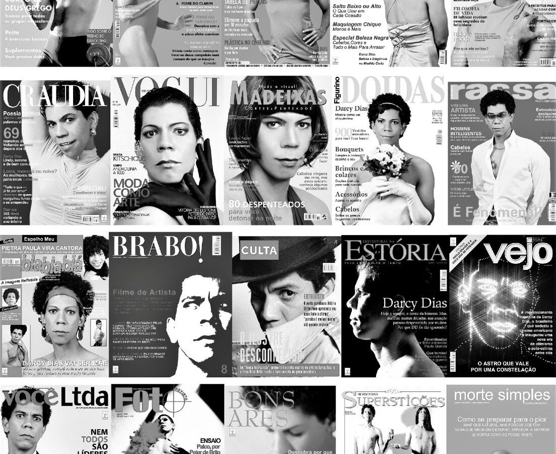 Entre 2005 e 2006 quando a internet e os celulares com câmeras ainda não se tinham popularizado tanto quanto agora, Peter de Brito criou a série “Autorretratos” composta de 25 revistas tamanho entre 25×30 e 2…Delas só vemos as capas, e nestas diferentes pessoas, todas elas identificadas como Darcy Dias. Dias é tanto um corpo masculino quanto um corpo feminino que encarna valores comportamentais passíveis de serem comercializados na forma revista. Em certa capa ela é tranquilidade, noutra elegância; pode ser ousadia, ou apontar contradições; na capa de Boa Fôrma, é disciplinada, enquanto em Rassa é o artista nordestino, corpo bom tornado símbolo nacional; em Vejo é o astro que renova as esperanças na nação que confia no futebol, mas aposta pouco no cinema; a sensualidade de Descarada destaca a travesti Darcy Dias como uma garotinha boba. Para o artista estamos num tempo em que podemos ser o queremos. Isto tanto pode implicar intervenções cirúrgicas e próteses, ou cosméticos que clareiam a pele, alisamentos de cabelos progressivos. Também a fotografia dada sua difusão nos fornecem os retratos que queremos ver diariamente, muitos dos quais são autorretratos ou selfies. Imaginem fosse verdade existisse a revista de comportamento feminino Craúdia todos os meses trazendo conselhos sobre sexo antes ou depois dos 60 anos; sugerindo as tintas ideais para ocultar a perda de cor dos cabelos da juventude; trazendo exemplos de arrependimento que põem em cheque a decisão de entrega apaixonada no estilo novela brasileira; no especial que toda boa revista deve ter destaca-se o triplo problema da passagem do tempo ligada ao envelhecimento e explicitamente exposta: tristeza, decadência e sofrimento. O rosto jovem de Darcy Dias, seu sorriso levemente despretensioso e nordestino encarando a câmera pré-programada resultam a imagem de uma mulher de bem com a vida que sabe vestir a roupa certa/brega e fazer o gesto impossível para a maioria das velhas, mesmo as que foram lindas na juventude. Lembremos que Darcy Dias nesta publicação não é a leitora, mas a modelo reinando sozinha na capa, seduzindo sua audiência. Ela aparece, como outras personagens femininas criadas pelo artista, sem os longos cabelos normalmente explorados nas revistas de moda, como uma obrigação da condição feminina, mesmo para as negras.
